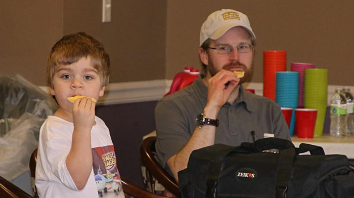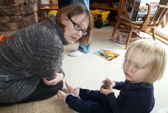 Showing off toys to Grandpa Kevin, GG, and Nancy.