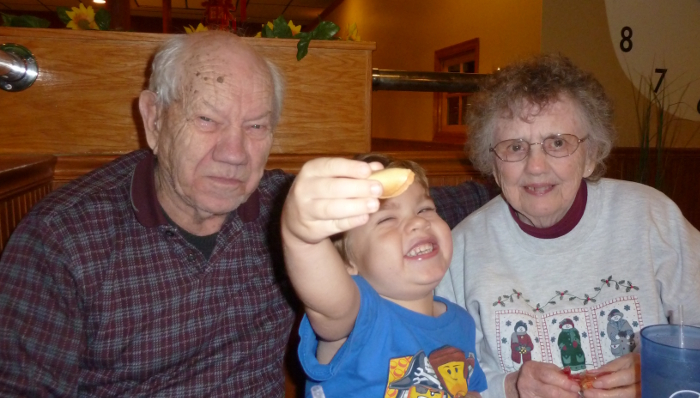 Having fortune cookies with Great-grandpa Les and Great-grandma Muriel.