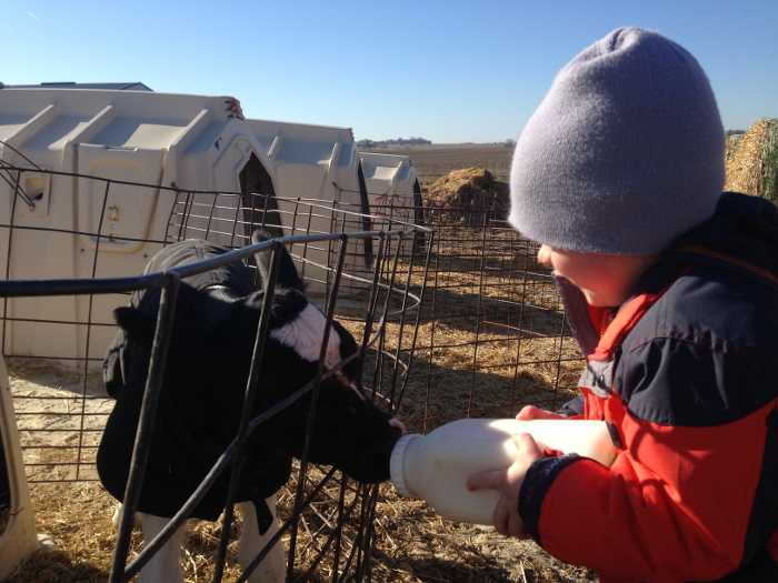 Saturday morning and Sunday morning I rode with Grandpa while he picked up his first load of milk each day. We went to three farms on Saturday and two farms on Sunday. On Sunday I got to feed the calves at one of the farms!