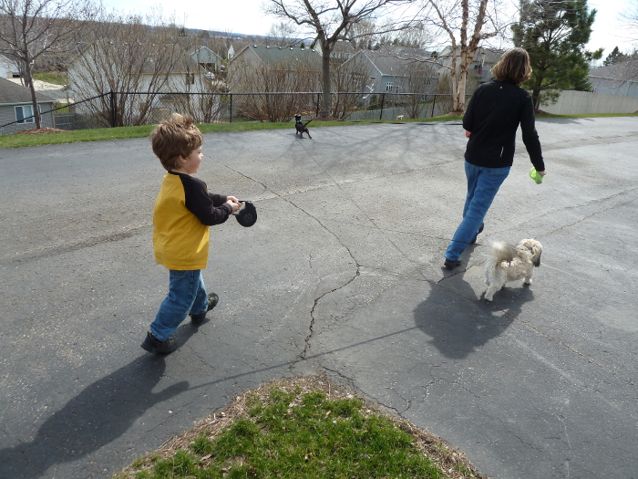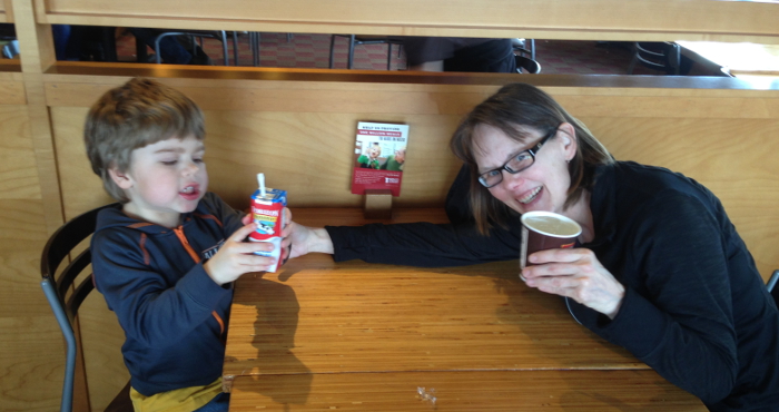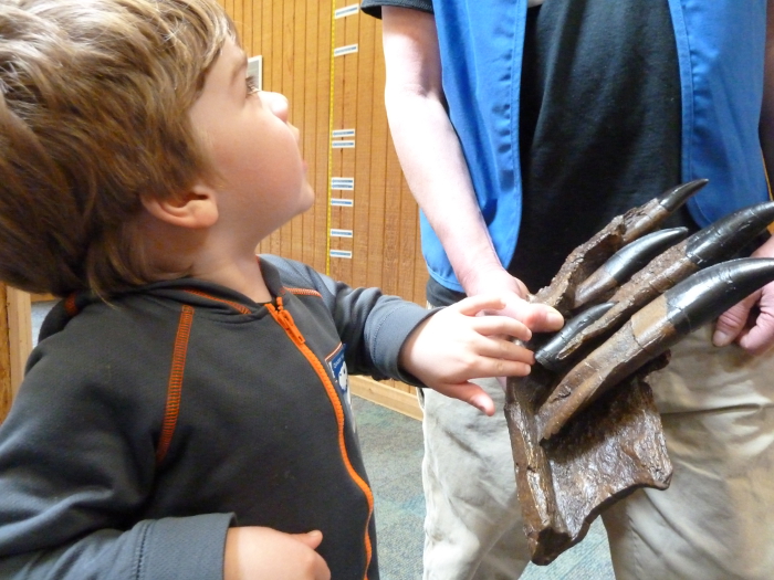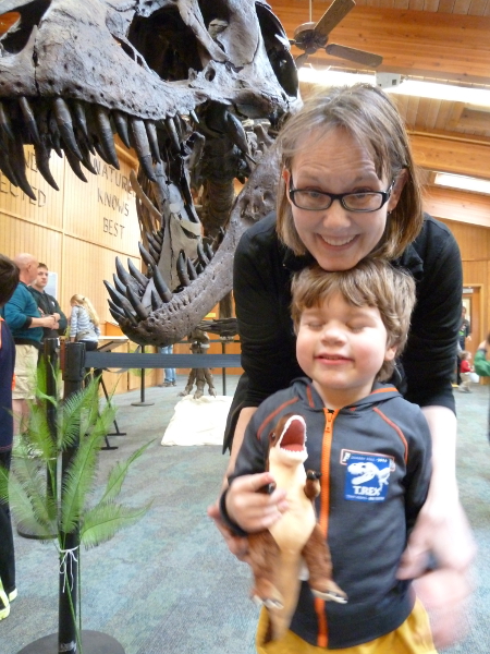 After I was done riding on Sunday, we stopped to see Great-grandma Dorothy for a few minutes on our way to see GG. We went to lunch with GG at Noodles, and then we went to see some fossils at the nature center. There was a T. rex and an Allosaurus. We also walked around the pond, and GG bought me a little T. rex I can take to school.