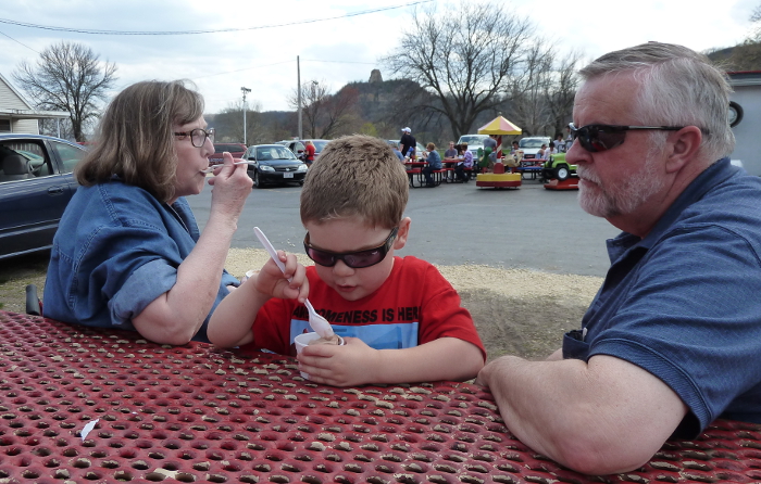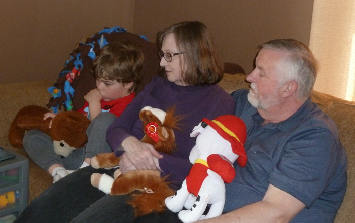 Grandpa Al and Grandma Wynne came to visit on Sunday while Mommy was doing homework. I picked up some more rocks with them and told them about our garden. Then Daddy made us all lunch. I watched some Daniel Tiger with Grandma and Grandpa before it was time to get my haircut. After the haircut, we went on a little adventure.