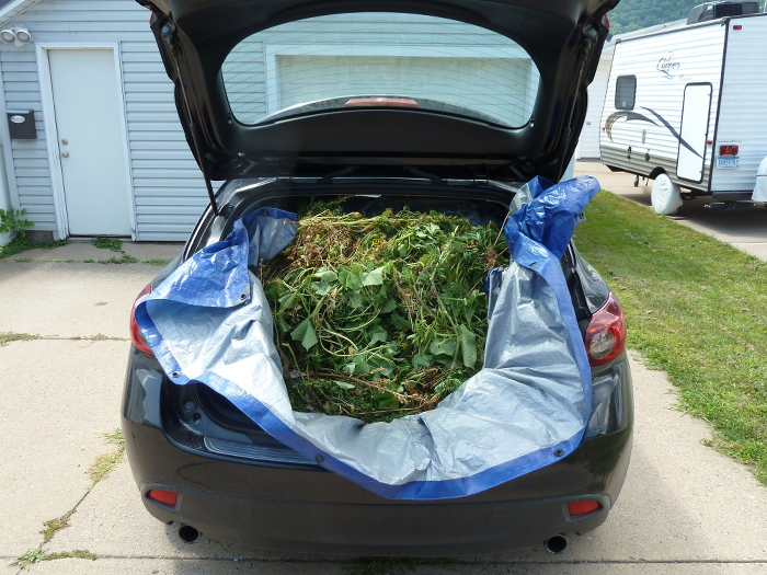We spent the night at Grandma and Grandpa's because Daddy was too tired to drive home. We went home Sunday morning and got to work in the garden weeding and pulling up the plants that were done growing for the season. We had so much to take to the compost site, Daddy had to transform the car into a dump truck.