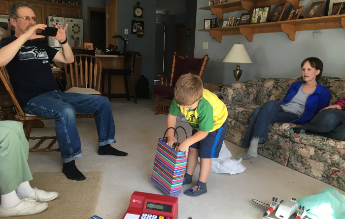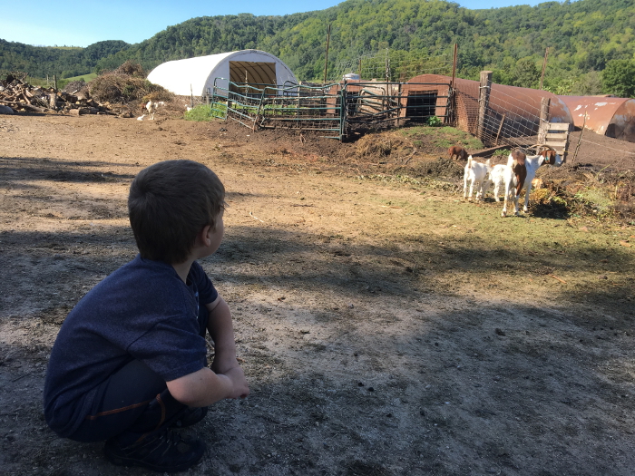 On Monday we went out to the old farm to look at the little bulldozer and the river, then we made the long drive back home. We stopped at Grandma and Grandpa's to return their car, and then we went back to our house with Mommy.