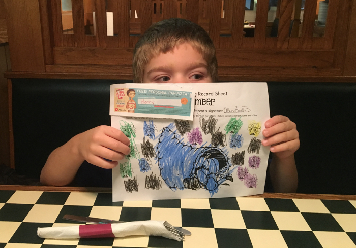 I finished my reading chart for the month, so Daddy and I went out to get my free pizza.