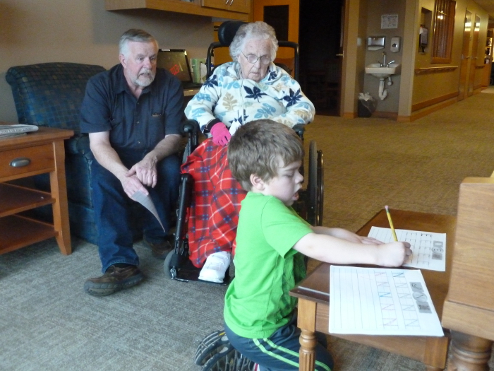 While I was away from home, I did some visiting - with Great-grandma Dorothy, Great-grandma Darlene, and with GG and Grandpa Kevin. And I learned how to play Sequence, and got some more practice at Tic Tac Toe and other games.