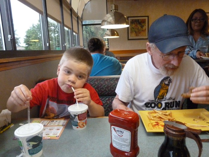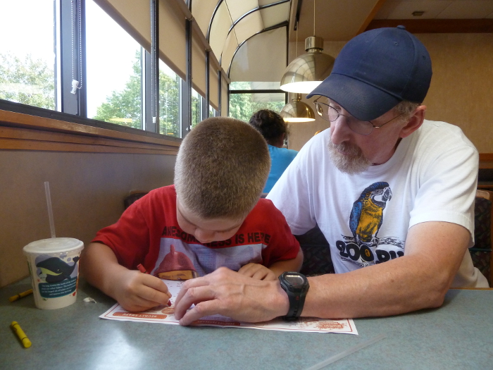 Drawing with Grandpa Kevin while we wait for food.