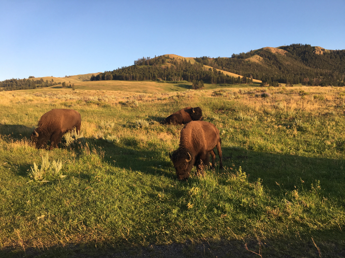We moved through Grand Teton and into Yellowstone as we had a long way to go to our cabin. We stopped to see the geysers - the main reason we added this leg of the trip. After that, we saw another black bear on the road to Cooke City, and a lot of bison in the Lamar Valley. We sat and watched them for about thirty minutes, and one of them almost rammed our car!