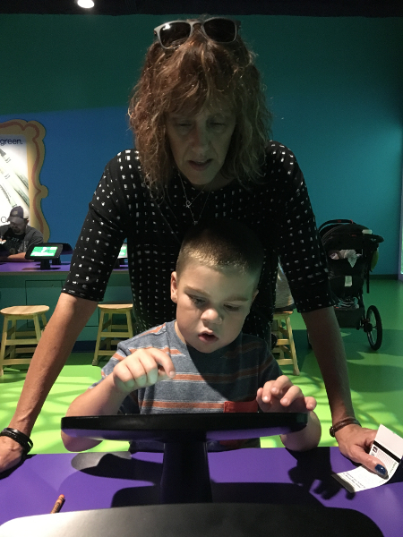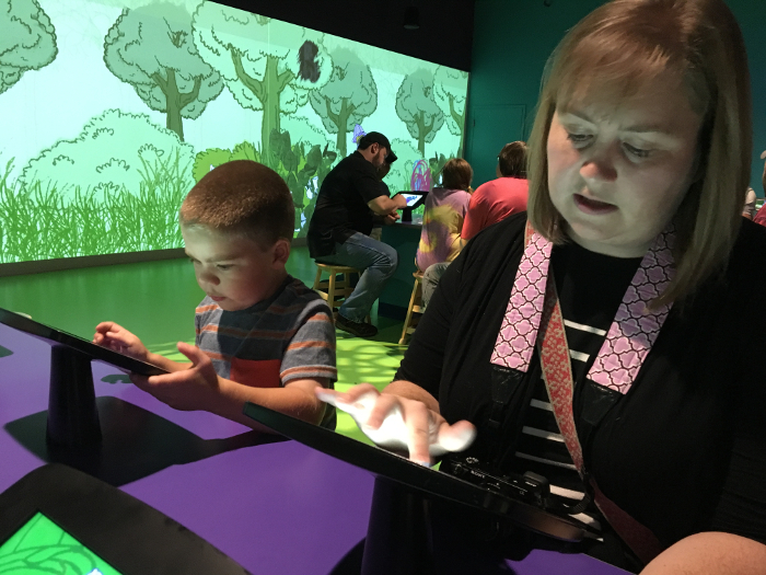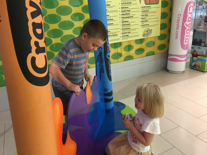 Showing Nancy one of the cool drawing toys they have at the Crayola Experience.
