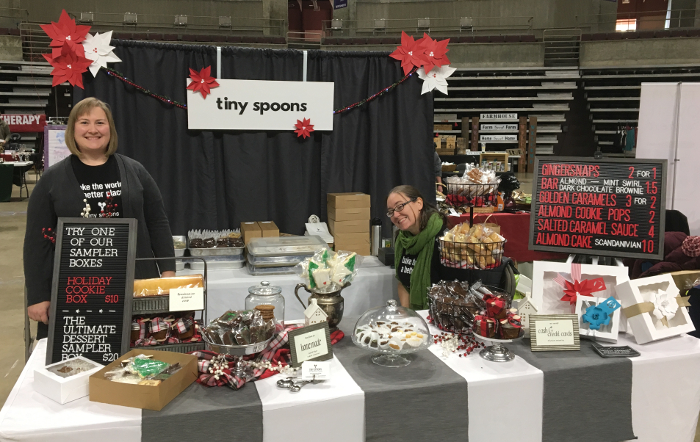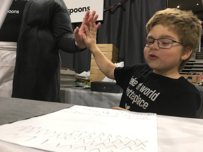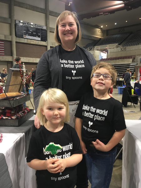 Saturday I went to help at the Tiny Spoons booth! We all wore our new shirts and Josh and Freya came down. Freya and I bought some slime and ran all over the civic center. Plus, we went to the Festival of Trees. I had a lot of fun, but we didn't sell much stuff. One of my jobs was to count the people who came to the booth.