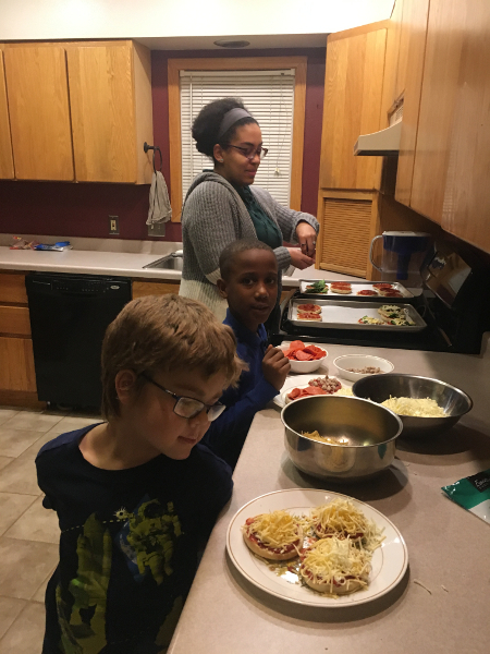 Making english muffin pizzas. Yum!