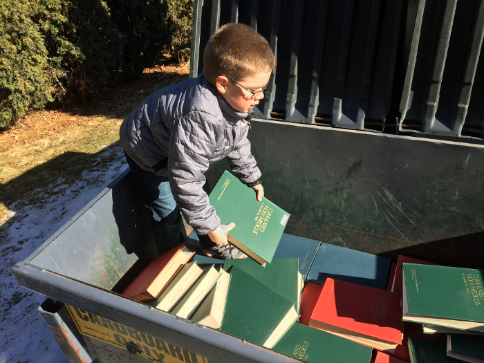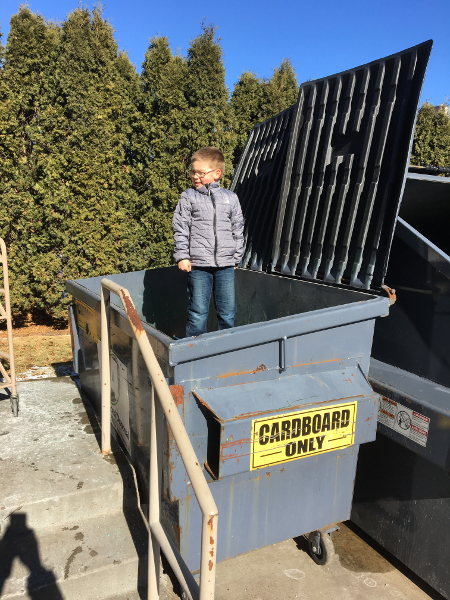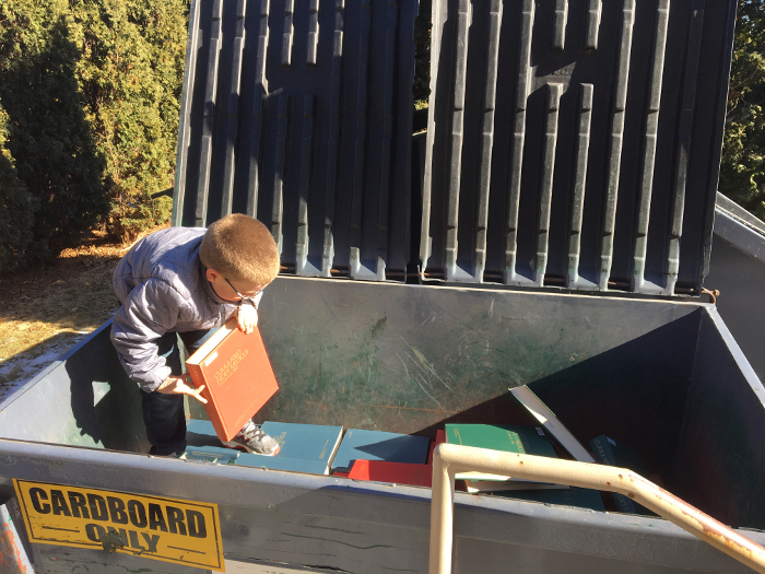 I also helped Daddy at work. We pulled some books and I got to help get rid of them by climbing into the recycling dumpster.