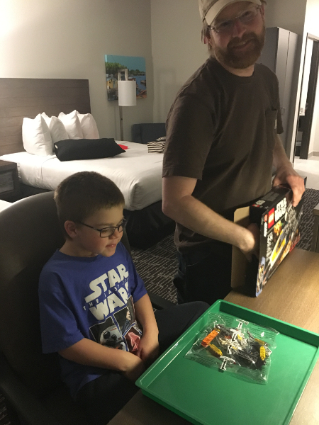 Thursday after school we went to stay in a hotel. I had to stay up all night for my EEG. Daddy stayed up with me and we built LEGO, went swimming, and watched Star Wars: The Last Jedi. We also explored all over the hospital.