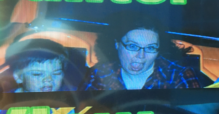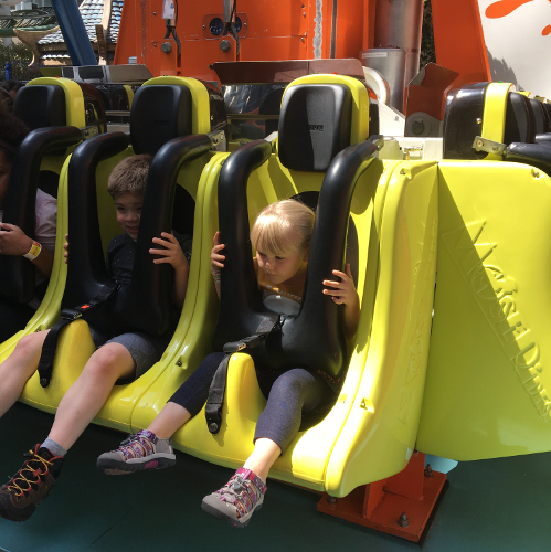 Me and Mommy getting ready to go on the upside-down roller coaster!