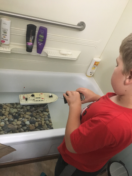 In non-sad news, I tried out my remote control boat I got at a garage sale, I went to the library with Mommy, I made muffins with Mommy and Sawyer, and we spent some time with Angie and her grand-daughter Delilah.