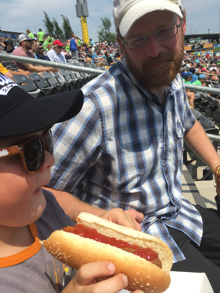 On Wednesday, we went to a baseball game for Mommy's birthday. It was really hot. We hid in the shade as much as we could, and Mommy and I watched the second half of the game from behind home plate, hidden from the sun. Daddy was close to getting a foul ball twice, but they landed next to other people who were able to grab them first. We ate a lot of expensive food, got sunburned, and had a good time. The Saints won, 10-3.