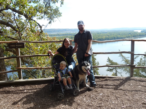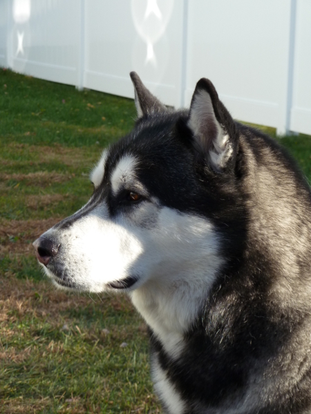 And Duke loved to walk. Well, really he just loved to sniff everything in the neighborhood - maybe it wasn't walking he loved. He might have been just as happy if we had fetched every tree and bush and post in a three-mile radius and held them to his nose for inspection, one-by-one. However, neither snow nor rain nor heat nor gloom of night (or early morning, for that matter) could keep him from his daily rounds. We could not say the word walk in his presence, so we spelled it - and eventually he seemed to learn how to spell just that one word. When someone said "walk," his ears would straighten up and rotate toward whomever said it. And then he would be right there, his front paws tapping on the ground in excitement, bumping into things and people, dancing toward the door. And if the walk didn't start fast enough? He would voice his displeasure and impatience with a deep trilling howl crossed with a growl - one of the best noises made by anyone or anything.