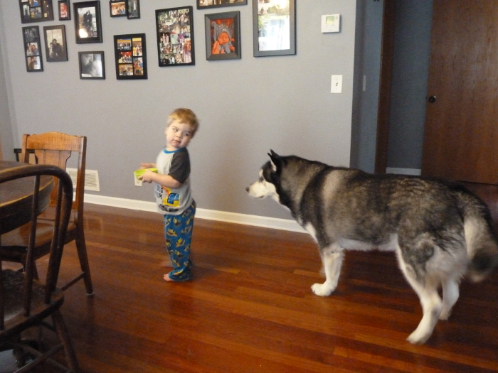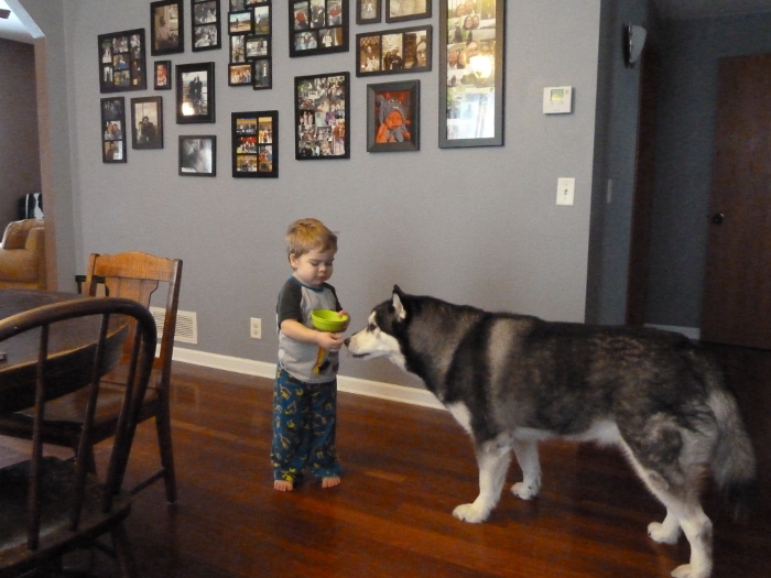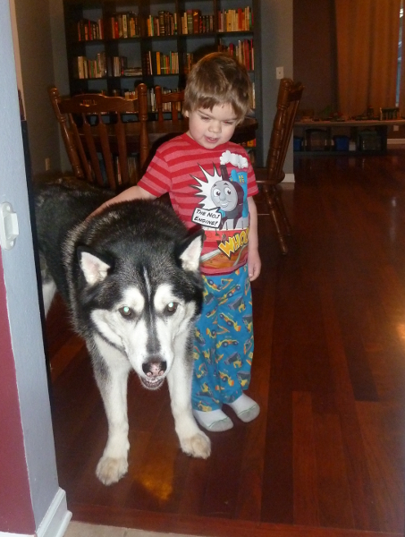 Duke protected us from squirrels and rabbits, and every dog that passed by - especially Buckles, the lab who menaced the neighborhood by wandering loose and shitting on everyone's yard. Duke's bark would scare just about anyone who came to the door, but he was harmless. One time when Duke yawned, Henry reached his hand up into those massive teeth - and Duke finished yawning but did not close his mouth or move until Henry's hand was out of the way.