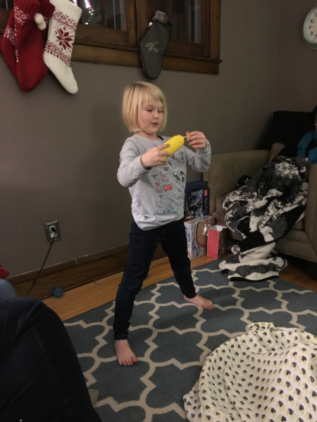 After all the fun at the market, we went back to Freya's and opened presents. And then we read some books and put on a show for the grown-ups, which included singing, dancing, hula hoops, costumes, magic, and a lot of laughing and screaming.