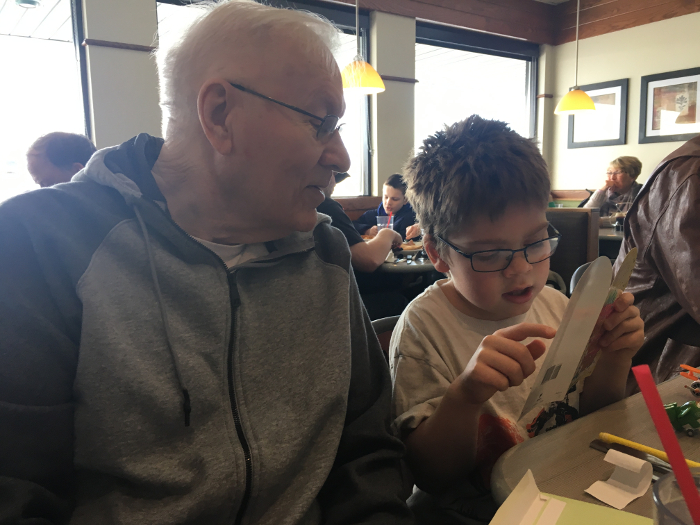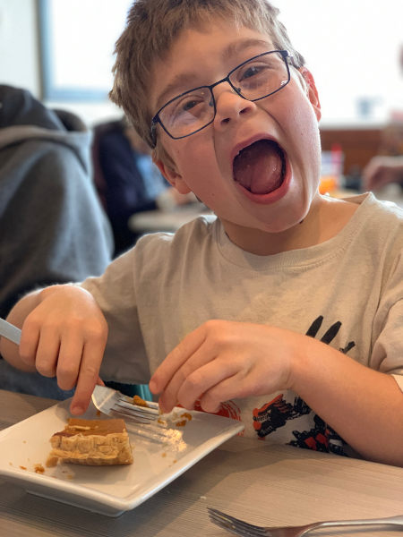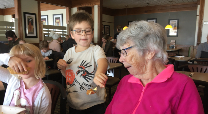 Sunday morning we went swimming, and then we went to have lunch with Great-grandma, Great-grandpa, and Ross. I learned some new things about Grandpa Joe from his Mommy and his little brother. And everyone sang happy birthday to me! I also got a free piece of pumpkin pie because it was my birthday - and I shared it with everyone who wanted some.