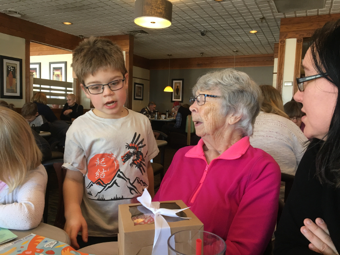 Opening an early birthday card from Grandma Wynne and Grandpa Al - so I can get my Zoo membership for my birthday adventure next weekend!