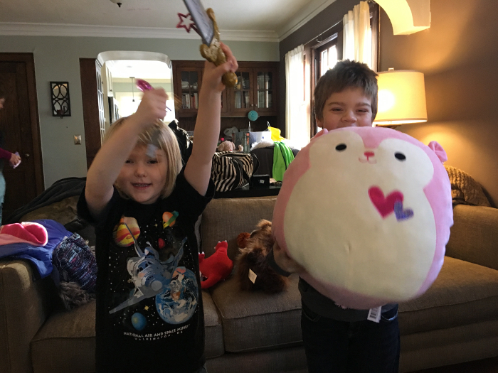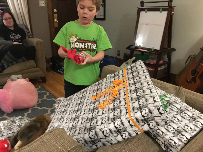 Here's a pile of presents from Freya, Kara, and Uncle Josh.