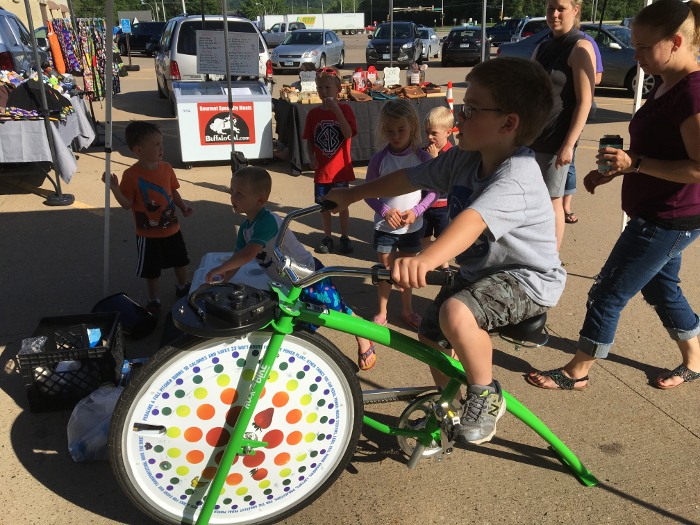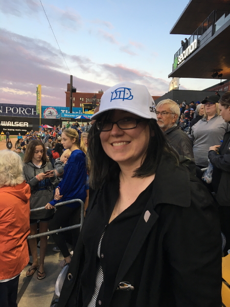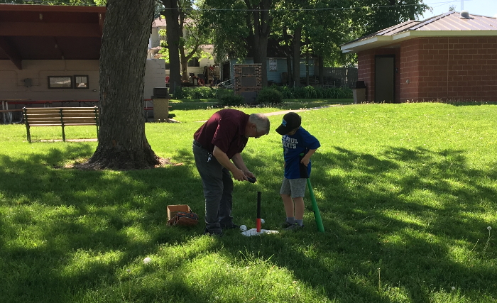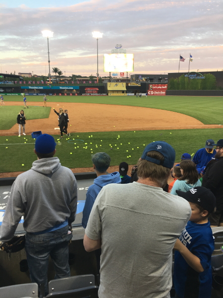 Daddy tossed a tennis ball into the hoop by first base and won a hat.