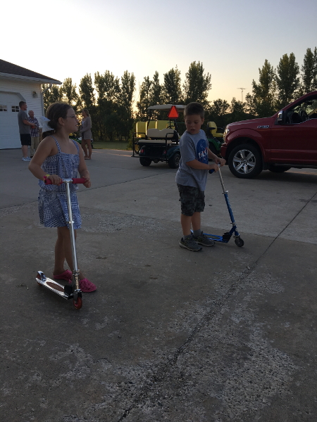 Saturday Mommy made breakfast for everyone. Later in the morning Bay came over and spent the day with me. We played board games, hide-and-seek, rode scooters and bikes, got driving lessons on the golf cart, ate snacks, and went for a boat ride.
