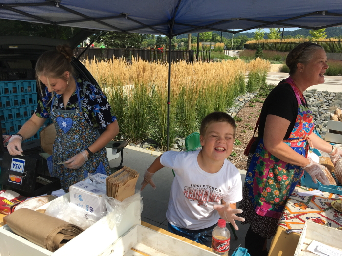 Helping Brita and Fiona at the market.