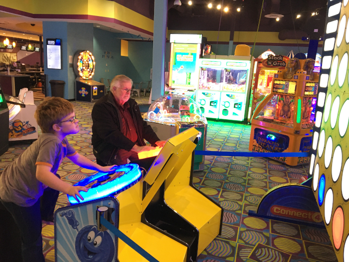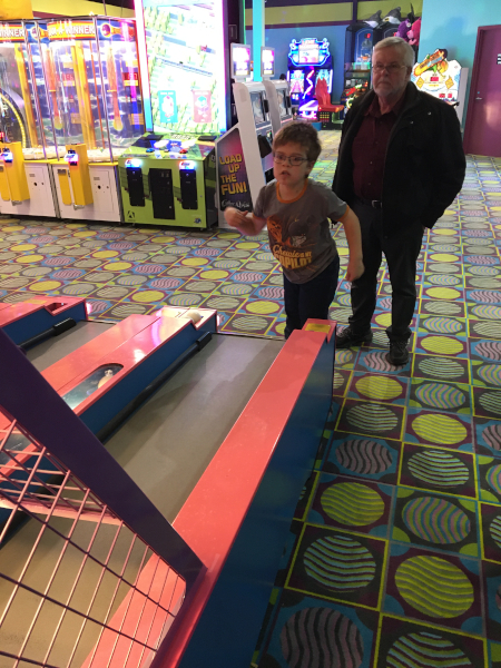 When we were going home, we met Daddy, Grandpa Al, and Grandma Wynne, along the way. And I got to play some arcade games with Grandpa Al.