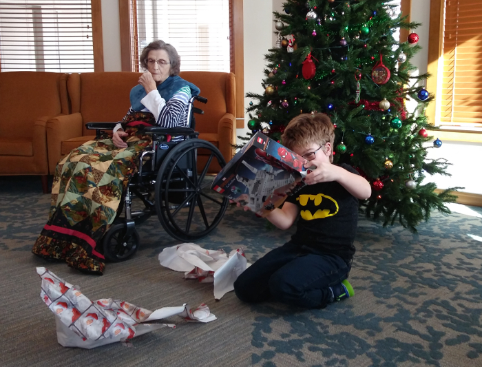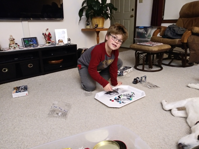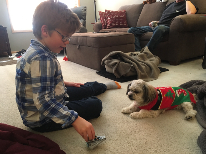 Helping put up the Christmas tree. We didn't have room for one at our house this year with all of the baking going on.