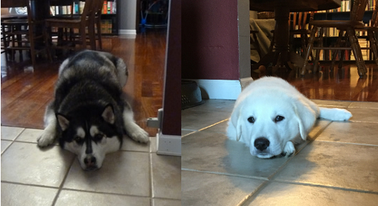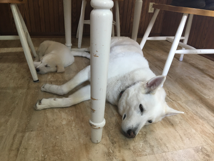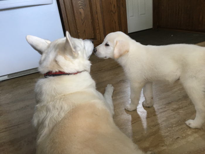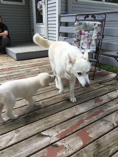 Saturday we went to introduce Indy to Uncle Neil and Loki. That went well: Loki was really gentle to Indy and she didn't seem at all jealous of the little pup.