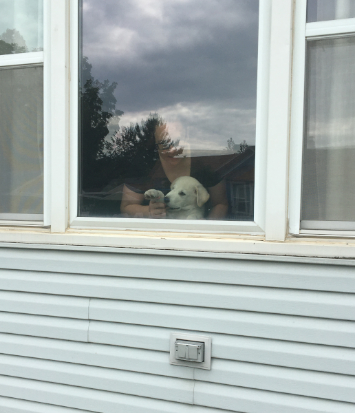 Learning to wave goodbye to Dad when he walks to work.