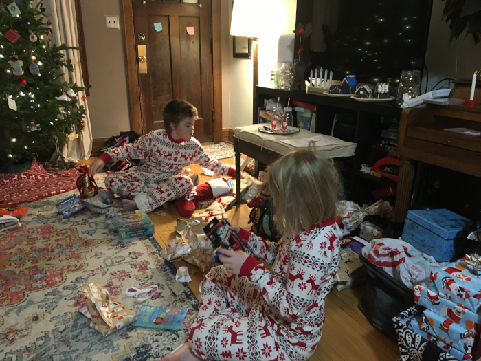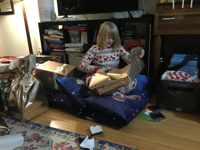 Working on my puzzle present - I had to follow clues to find it. Freya did one as well.