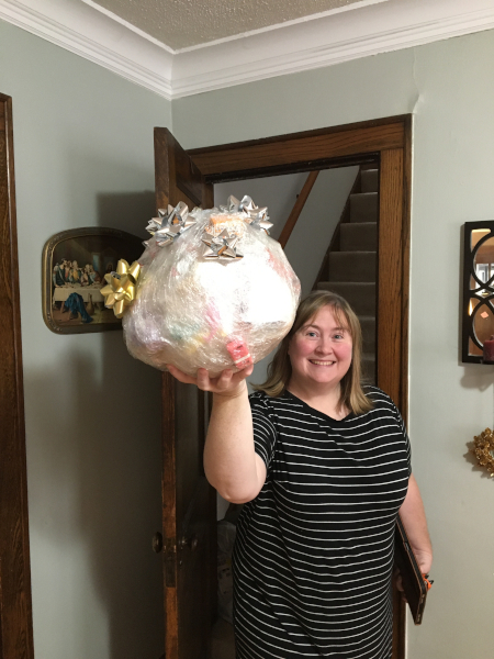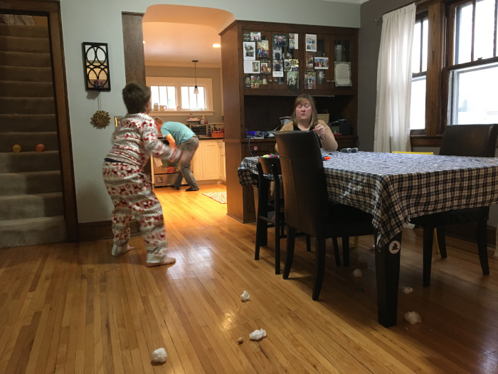 Having an indoor "snowball" fight with the wrapping from the prize ball.