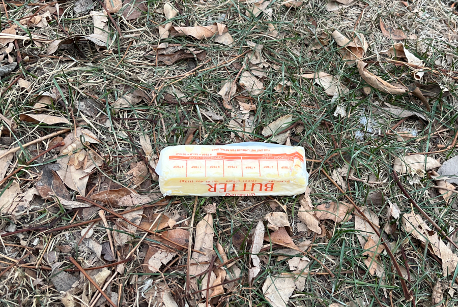 Dad saw the butter on the gorund walking to work. Mom said he should pick it up - that's $2 worth of butter at current prices. (She was kidding about picking it up, but no joke about butter prices - they're crazy!)