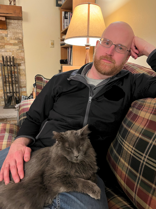 Sunday I was feeling well enough to go see Jonathan. We played with LEGO in his room, played hide-and-seek and chased the cats around. The grown-ups just talked. We had delicious pizza for supper and ice cream for dessert! I had a lot of fun. And we didn't manage to get a picture of Jonathan or his parents, so it's just me and Dad and some LEGO...and Malcolm the cat.