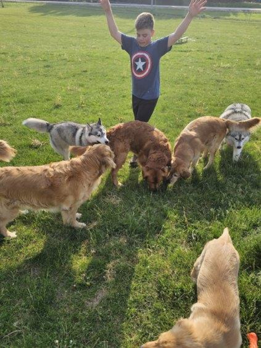 Mom let me skip school on Friday, so Grandpa Al and Grandma Wynne picked me up on Thursday night so I could go to the dog park early on Friday before it got hot. We also went on Saturday morning. Here are some pictures of me with my furry friends.