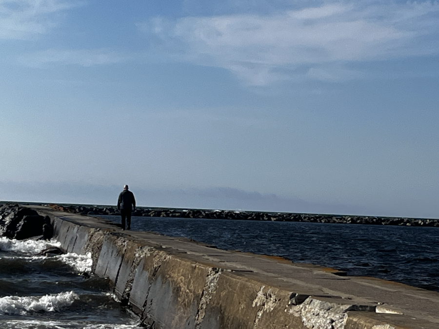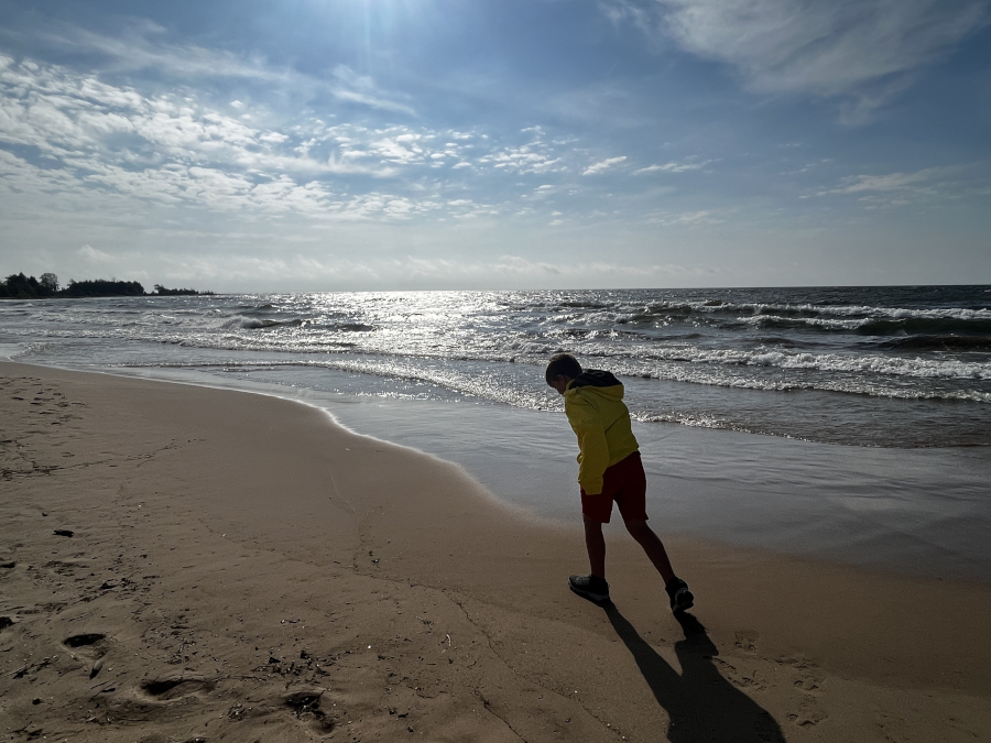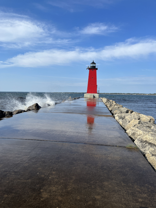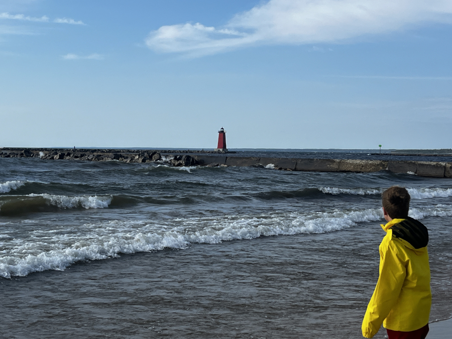 Our first stop was the Manistique Lighthouse. It was really windy. Mom and I stayed on the beach, but Dad walked out to see the lighthouse, dodging waves that crashed over the walkway.