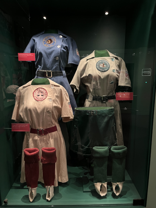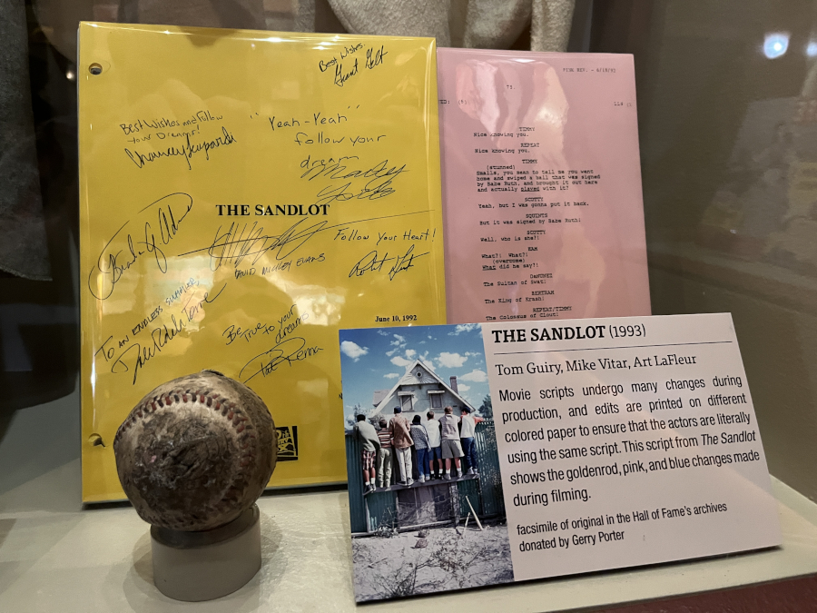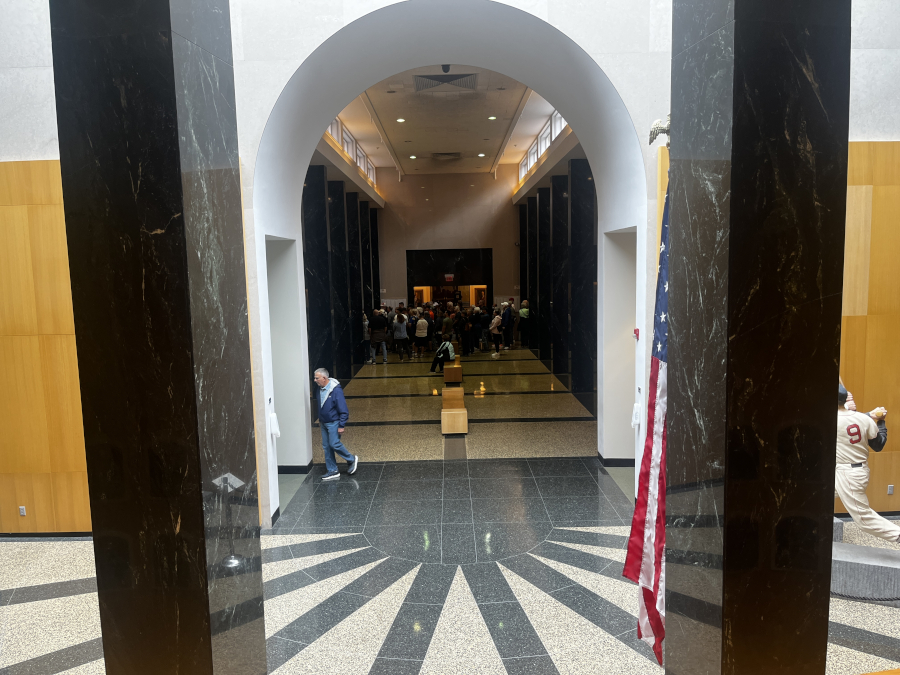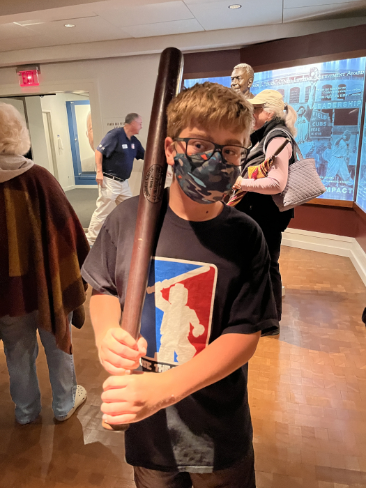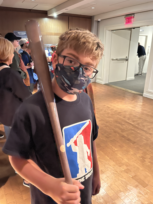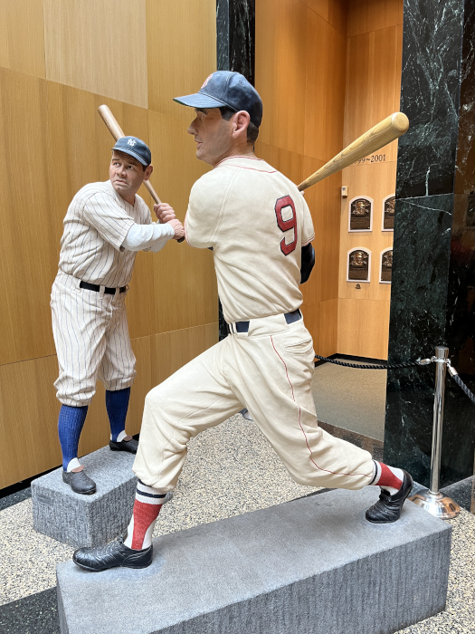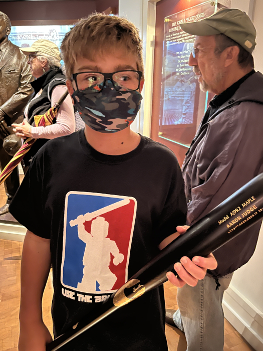That was a taste of the museum. Then we went down to the Hall of Fame for a talk on how the selection process works, how the Hall has changed over the years, and some stories about the players. Before the talk started, the guide gave an extra little talk about the evolution of baseball bats - and we got to hold a replica Babe Ruth bat and actual bats used by Aaron Judge and Mookie Betts!