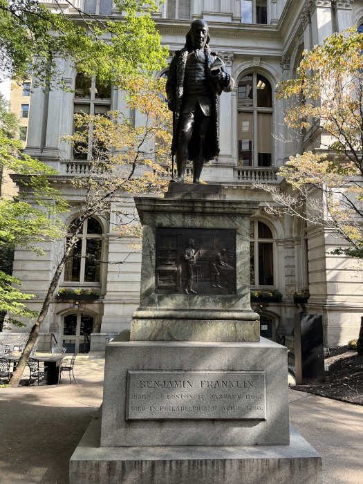 The Ben Franklin statue at Old City Hall, which is also the site of the Old Latin School, where Franklin, Sam Adams, John Hancock, and other founders went to school.