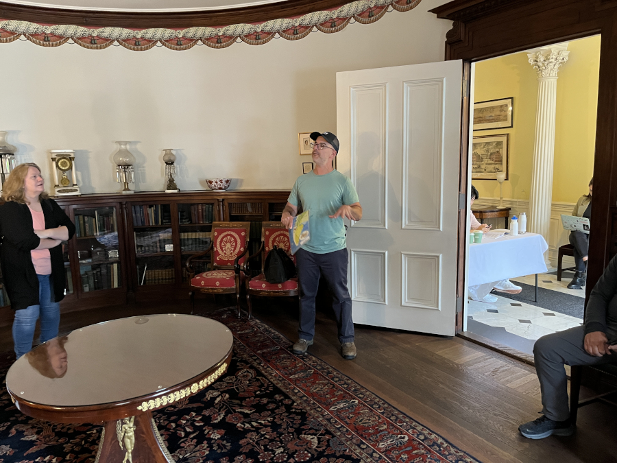 Dave explained how the money in the neighborhood was originally made from shipping, but later the wealth was from making cotton textiles. The wealthy Bostonians who were against slavery actually helped perpetuate it by providing a profitable market for slave-grown cotton processed by the cotton gin and the water loom, both of which made New England rich.