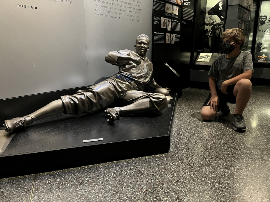 A cool sculpture of Jackie sliding home.