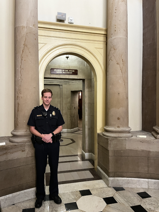 This poor guy had to guard the door of Kevin McCarthy's office while everyone takes pictures of the now-incorrect signs that says he is Speaker of the House.