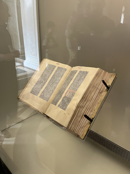 A Gutenberg Bible. The Library's copy is in three volumes, and they rotate them through the display every six months, and change the pages displayed every month so the pages don't get light damage.