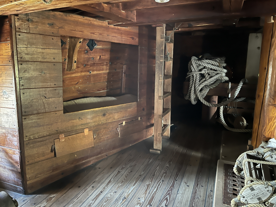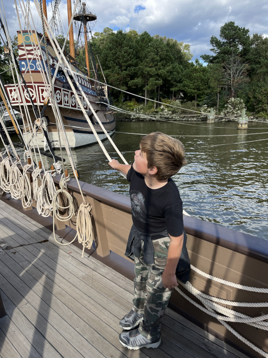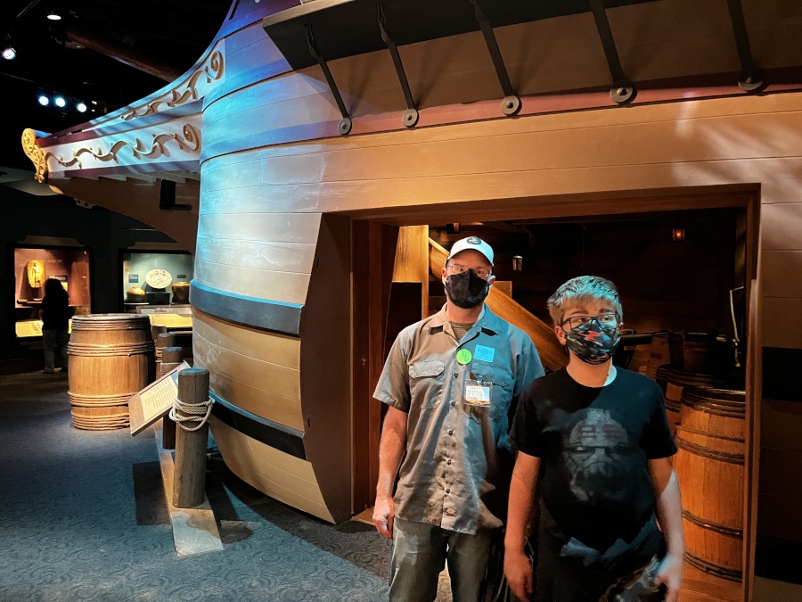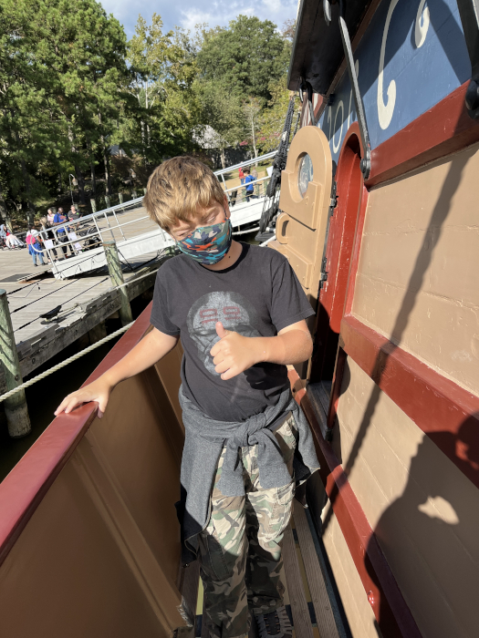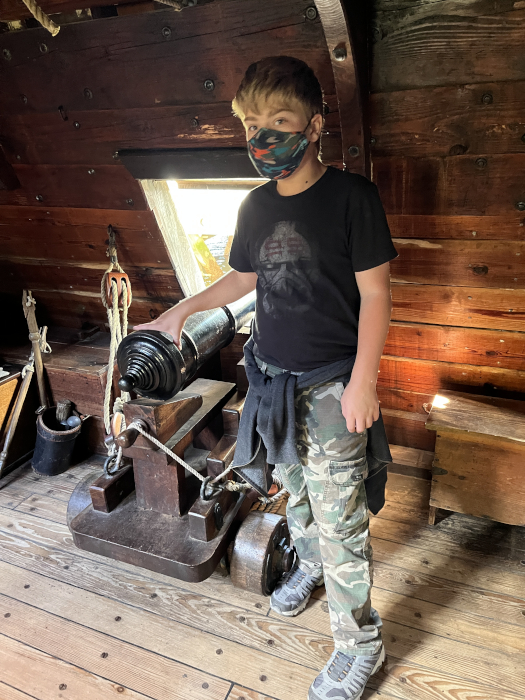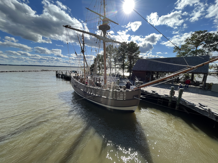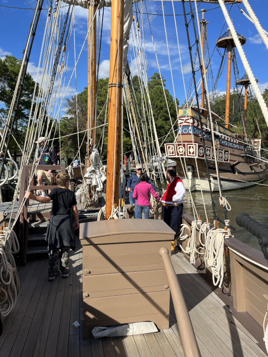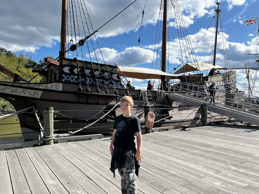 In front of the Susan Constant, the ship our ancestor, Captain Christopher Newport, sailed. This is one of the ships that brought the colonists over.