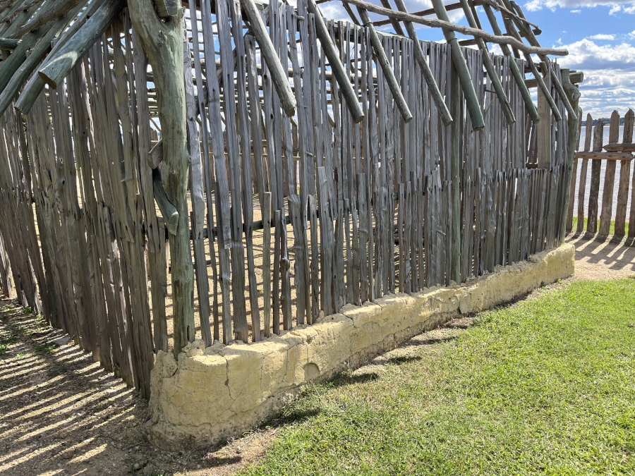 A reconstructed wall that follows the line of the actual wall. Just under the topsoil is a layer of clay. When the workers dug to find the wall location, they found the actual spots where the posts for the palisade were - the locations were colored a different shade of red from the surrounding clay, a change caused by the chemical interaction of the decaying wood with the clay.