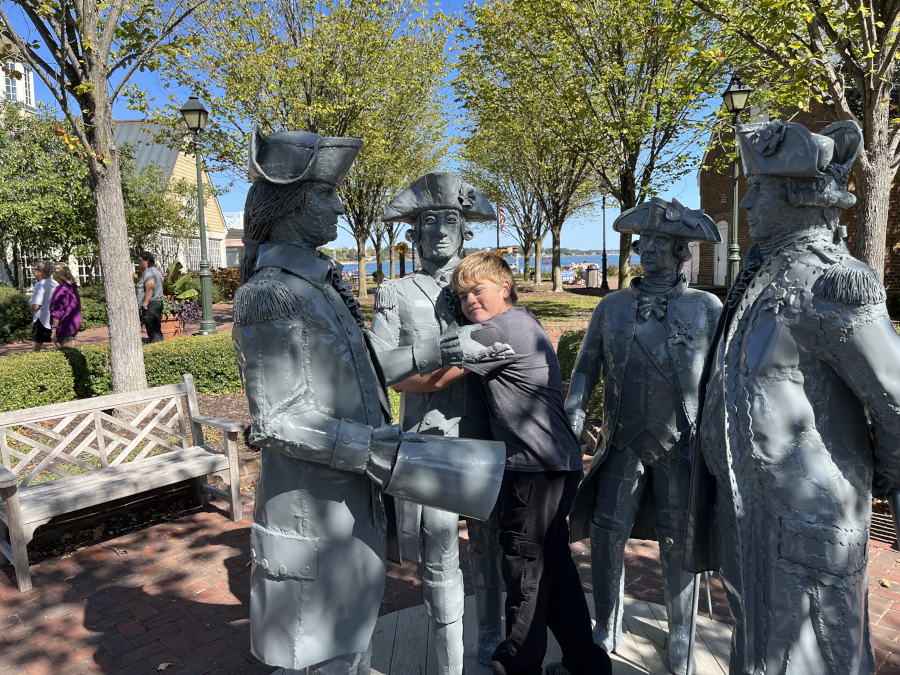 Some fun sculptures in the little cluster of shops. From left to right: General Washington, General Lafayette, General Rochambeau, and Admiral de Grasse - the big played for the Americans and French at Yorktown.