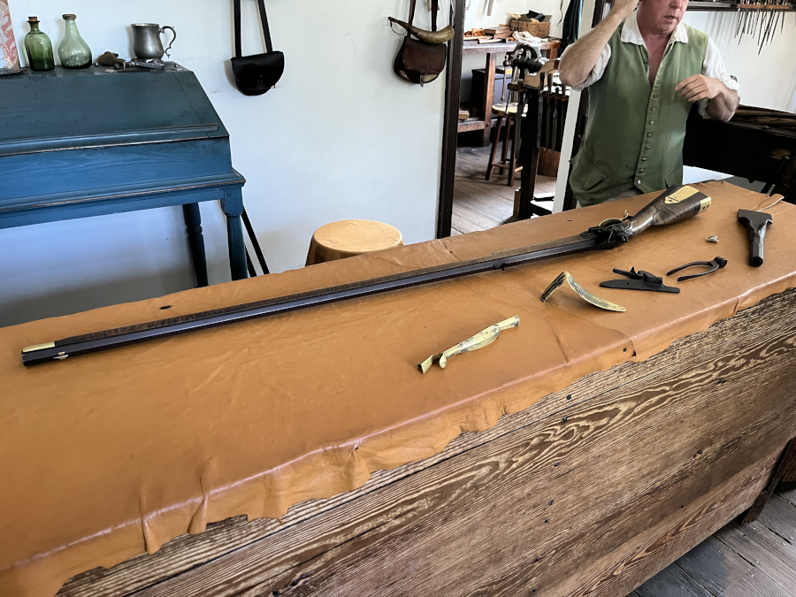 We went to see the gunsmith - where they actually still make guns as they would have in the 1700s! You can even buy them, if you're willing to wait ten years on the list and pay $20,000. This is a rifle gun, which was the only type of gun being made in America at the time. Muskets and fowling pieces would have all come from England or France.