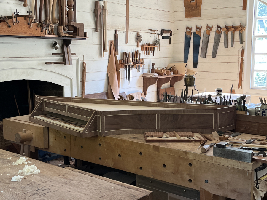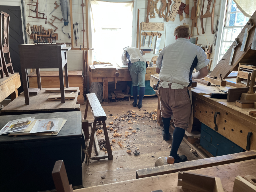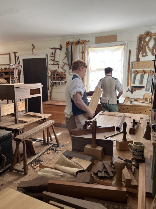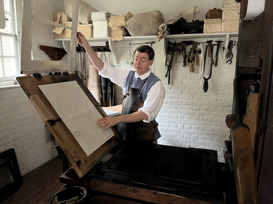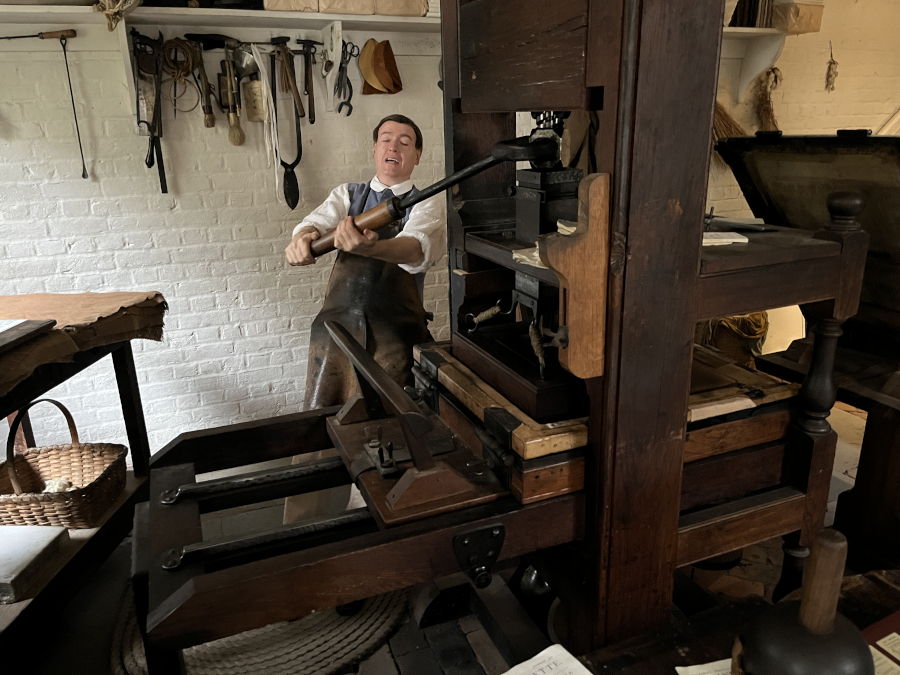 Downstairs was the printer. He was working on printing the paper. Other than the paper, the printer would publish broadsides and the occasional pamphlt, but most work in Williamsburg was for the government, since the Capitol and the House of Burgesses were right down the street.