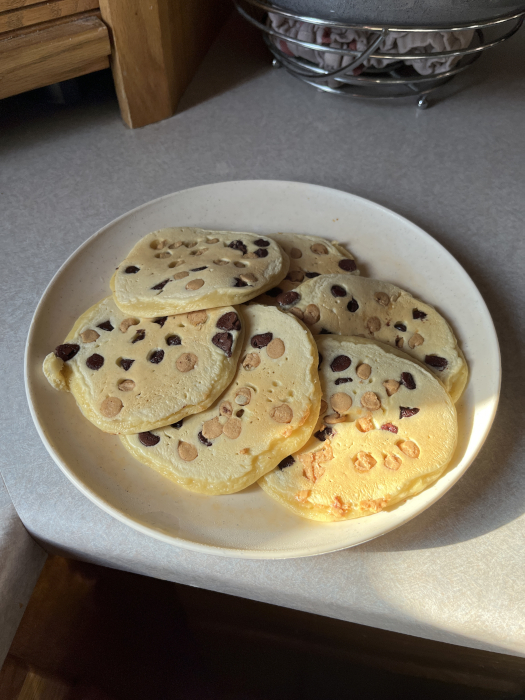 Monster pancakes - with chocolate chips, peanut butter chips, and white chocolate chips!